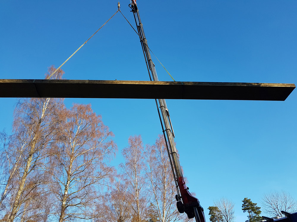 Vi transporterar modulerna på vanlig lastbil med släp och modulerna lyfts direkt från bil till uppställningsplatsen och eliminerar behovet av ställningar och bodar.
